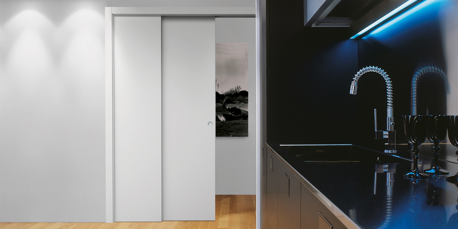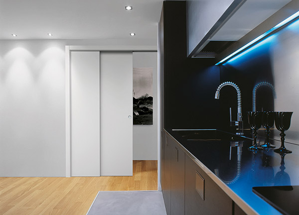 Одним простым жестом и первое, и второе полотно задвигаются в пенал до полного открывания проёма. Две разные комнаты при необходимости превращаются в одно большое помещение.